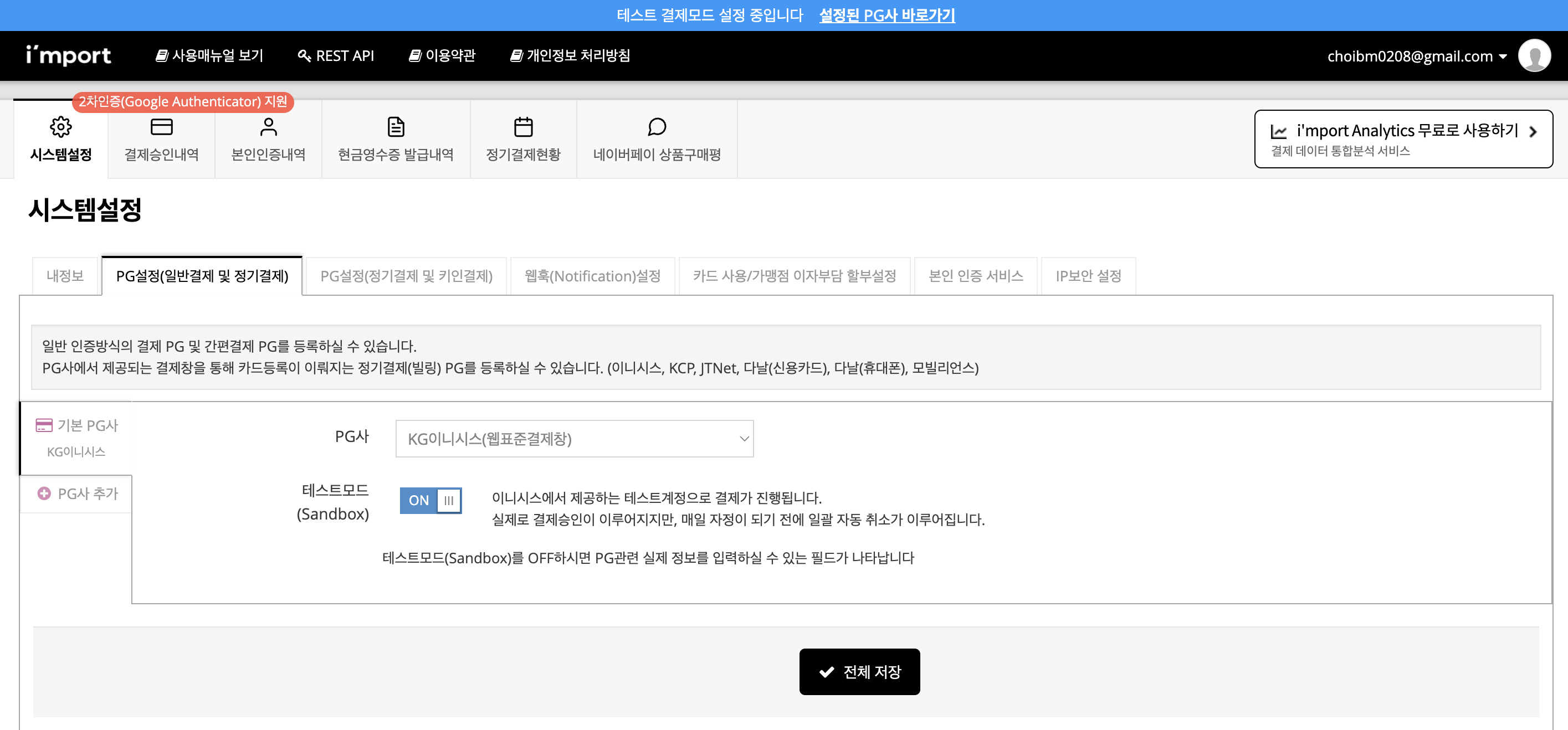 2-3 시스템 설정 - pg설정으로 가서 테스트 모드 on 한 뒤 전체 저장