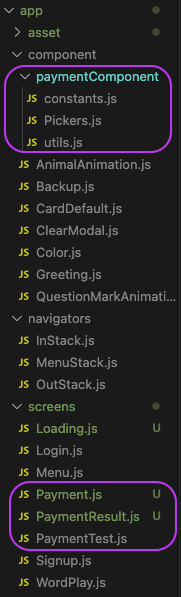 screen에 해당하는 PaymentTest.js, Payment.js, PaymentResult.js