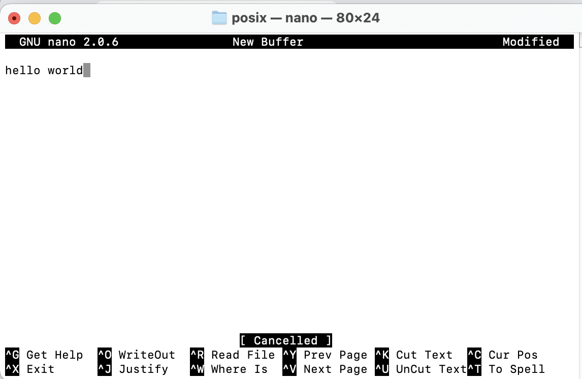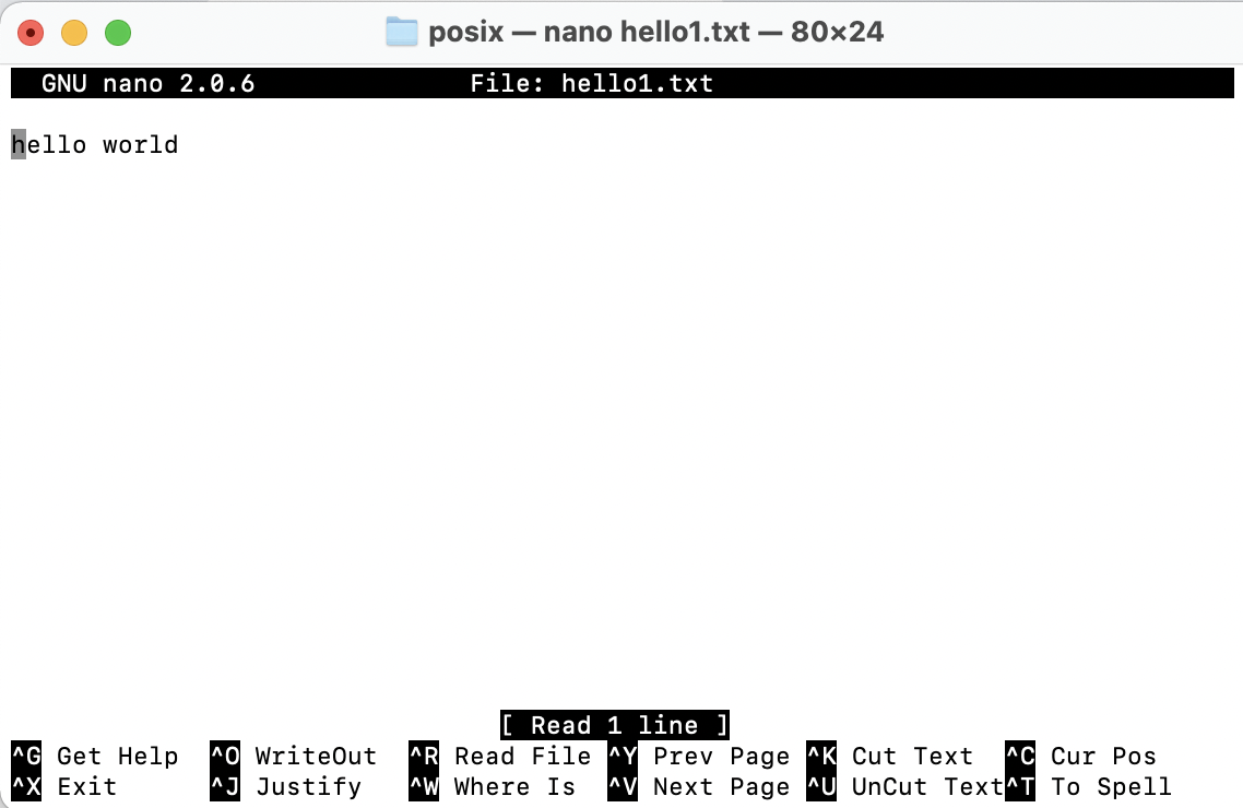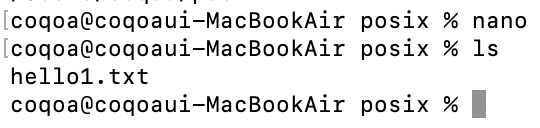 읽기 : nano hello1.txt 혹은 cat hello1.txt (cat은 화면에 출력하고 끝나는 명령어다