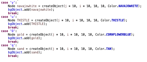 Node navajowhite = createObject(j * 10, i * 10, 10, 10, Color.NAVAJOWHITE);