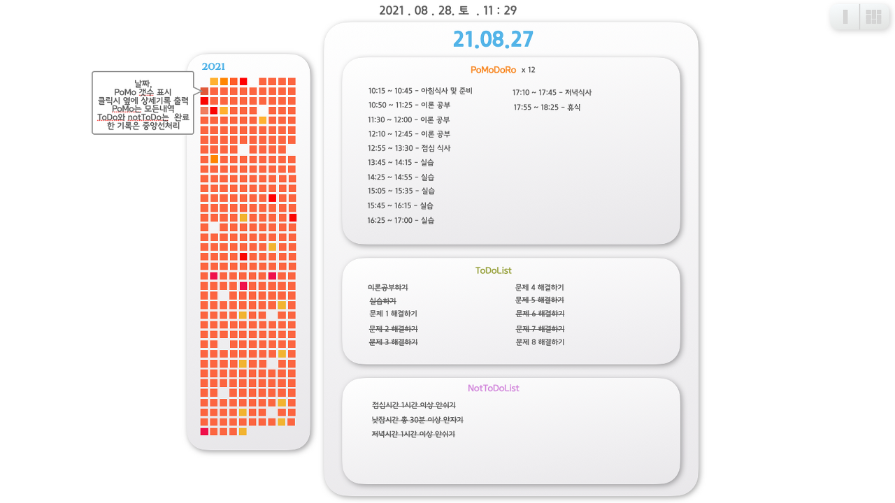 (달력과 색깔을 통해 현재까지 공부한 일자와 시간을 시각적으로 표시하기)